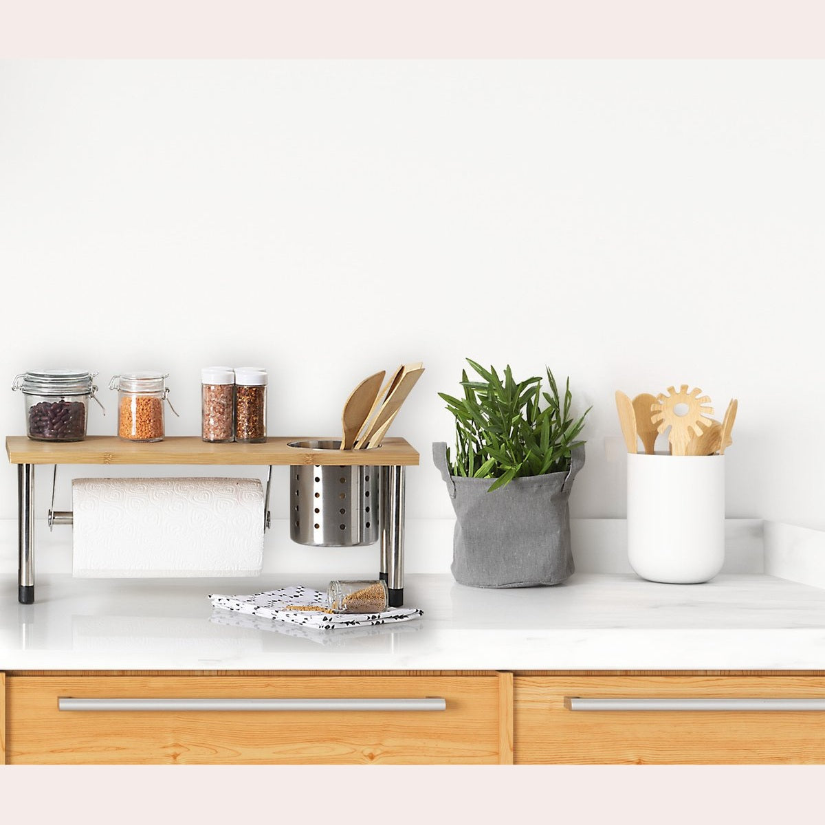 5Five keukenrek/aanrecht organizer met keukenrolhouder en keukengerei houder gemaakt van bamboe hout en roestvrij staal. Multifunctioneel rek voor in de keuken om o.a. kruidenpotjes, weckpotten/voorraadpotten en keukengerei in op te bergen. Bovendien heeft de organizer een keukenrolhouder om keukenrol bij de hand te houden. Materiaal: bamboe hout en rvs. Afmeting keukengerei houder: Diameter: ca. 12,5 cm. Hoogte: ca. 14 cm. Afmeting keukenrek: ca. 55,5 x 20 x 21 cm.
