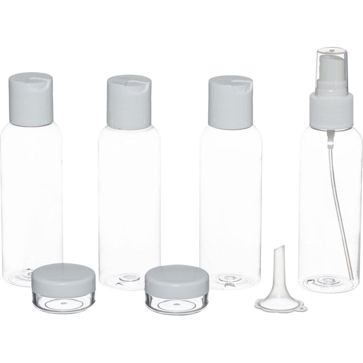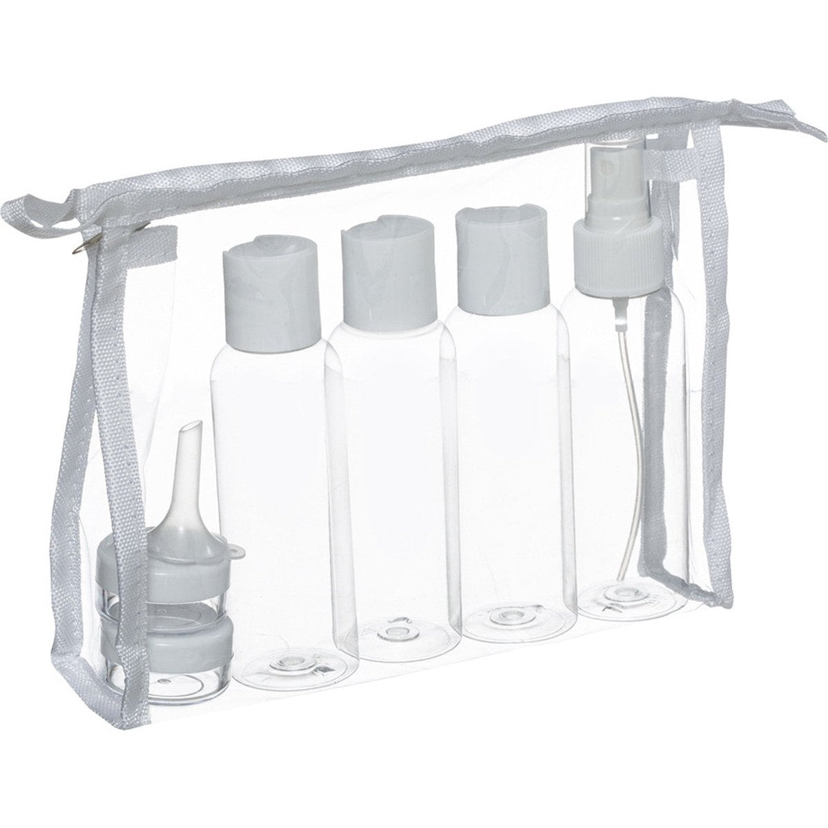 Reisset flesjes van Five®. Met vier flesjes en twee potjes voor crème. Navulbaar en geleverd in een handige etui. Deze reisset met flesjes bevat 3 flesjes met een press dop en 1 flesje met spuitdop die alle vier 4 cm breed en diep zijn en 10 cm hoog. De kleine potjes voor bijvoorbeeld crème zijn 4 cm breed en diep en 2 cm hoog. Er wordt een trechtertje meegeleverd om de flesjes gemakkelijk na te vullen. Het etui is 20 cm breed, 5 cm diep en 16,5 hoog en is afsluitbaar met een rits. Op reis met reisflacons De reisflacons van Five® zijn handig in gebruik tijdens een vliegvakantie. Zo kan je al je favoriete verzorgingsproducten meenemen, zonder grote flessen mee te sjouwen. Reisset flesjes kopen Neem jij voortaan deze reisflesjes mee op reis? We hebben nog meer handige opbergers voor als je met de auto