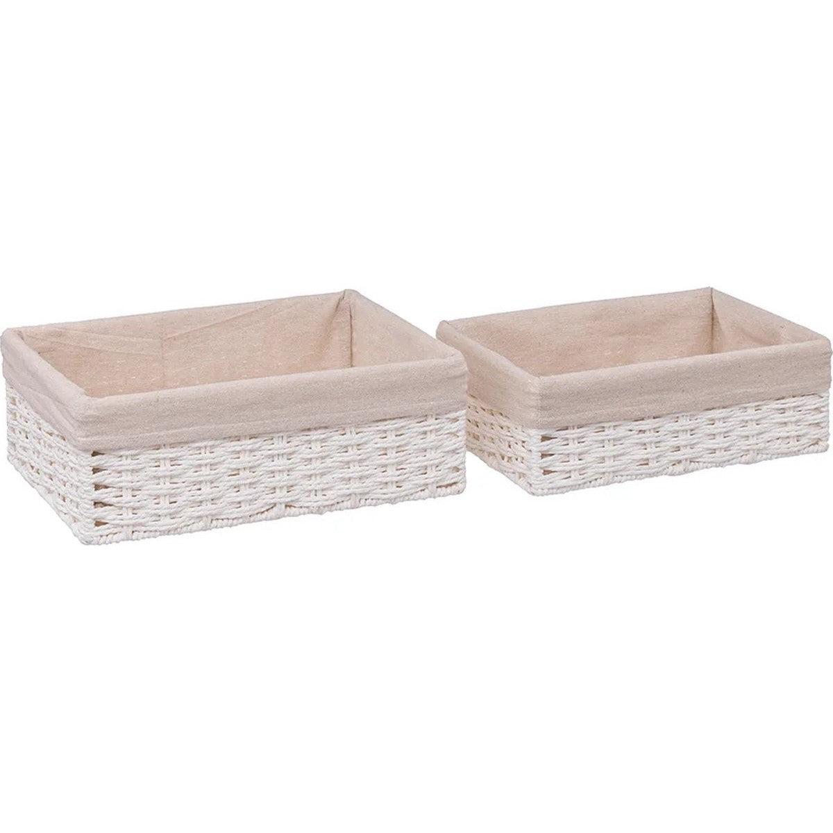 Op zoek naar een vleugje elegantie in je interieur? Deze witte manden met een stevig stalen frame, omhuld met hoogwaardig papier en voorzien van een stoffen voering, bieden hiervoor de perfecte oplossing. De set heeft twee verschillende formaten om aan jouw verschillende opberg behoeften te voldoen. Het vlechtwerk geeft deze witte manden een verfijnde en stabiele structuur die mooi past bij elke inrichting. De toegevoegde stoffen voering in beige kleur zorgt ervoor dat (delicate) voorwerpen veilig worden bewaard. Deze is verwijderbaar zodat je hem indien nodig kunt wassen. De manden komen in een set van twee met elks hun eigen afmetingen: * Small: De kleinste mand is 20 cm breed, 28 cm diep en 10 cm hoog * Large: De grootste mand is 23 cm breed, 32 cm diep en 11.5 cm hoog. Witte manden voor elke gelegenheid Of je nu je woonkamer wilt verfraaien, je badkamer wilt organiseren of gewoon een charmante flair wilt toevoegen aan je interieur, de witte manden bieden de perfecte oplossing. De witte rieten manden van de collectie van Five