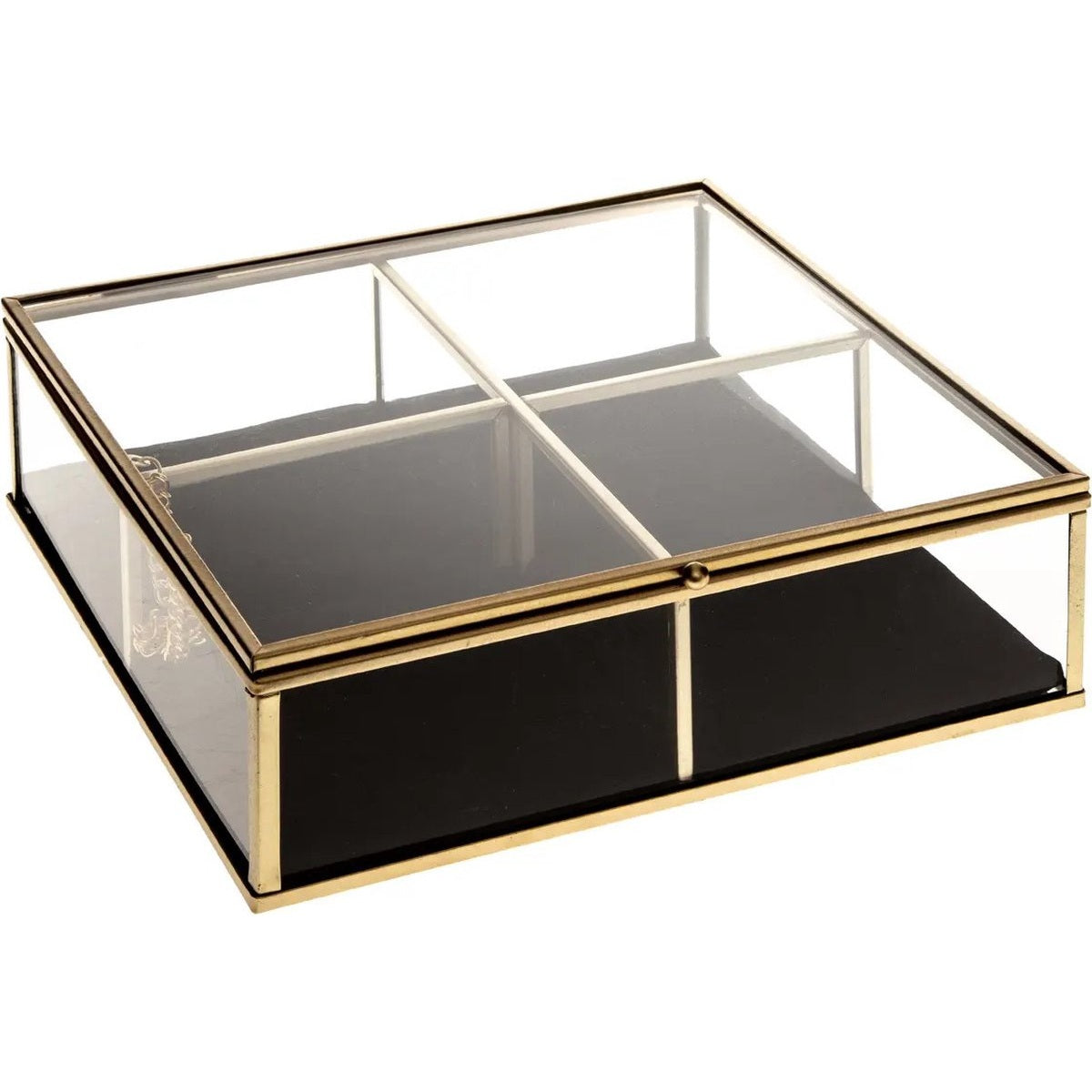 Sorteer je sieraden in dit glazen sieradenkistje van Atmosphera. Eenvoudig design met gouden frame en zwarte inzet. Deze glazen box bestaat uit een ijzeren frame met een zwarte inzet dat de sieraden tegen krassen beschermd. De deksel is ook volledig gemaakt van glas. Deze organizer is beschikbaar in twee verschillende formaten met de volgende afmetingen: * Medium: 20 cm breed, 20 cm diep en 6 cm hoog. * Large: 25 cm breed, 10,5 cm diep en 6,7 cm hoog. Sieradendoos glas gebruiken Hoe kan ik mij sieraden beschermen? Dit glazen sieradenkistje van Atmosphera