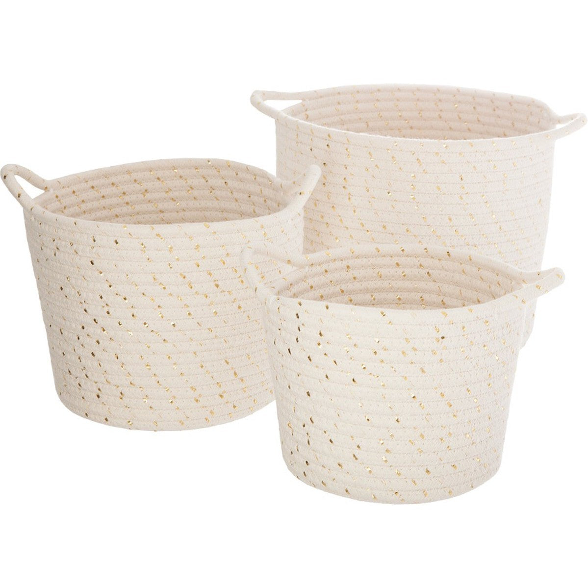 Deze opbergmanden set met goudvlokken van Atmosphera is ideaal voor bij jou in huis. Deze set heeft een prachtig design en mooie kwaliteit. Deze ronde manden zijn gemaakt van polyester. De opbergmanden set bestaat uit drie ronde manden met drie verschillende afmetingen. Small: 19,5 cm in diameter en 13 cm hoog. Medium: 22 cm in diameter en 16,5 cm hoog. Large: 24 cm in diameter en 21 cm hoog. Deze ronde manden bij jou in huis Begin nu met het organiseren en opruimen van kleding, knutselspullen, schoenen of speelgoed door gebruik te maken van deze set opbergmanden van Atmosphera