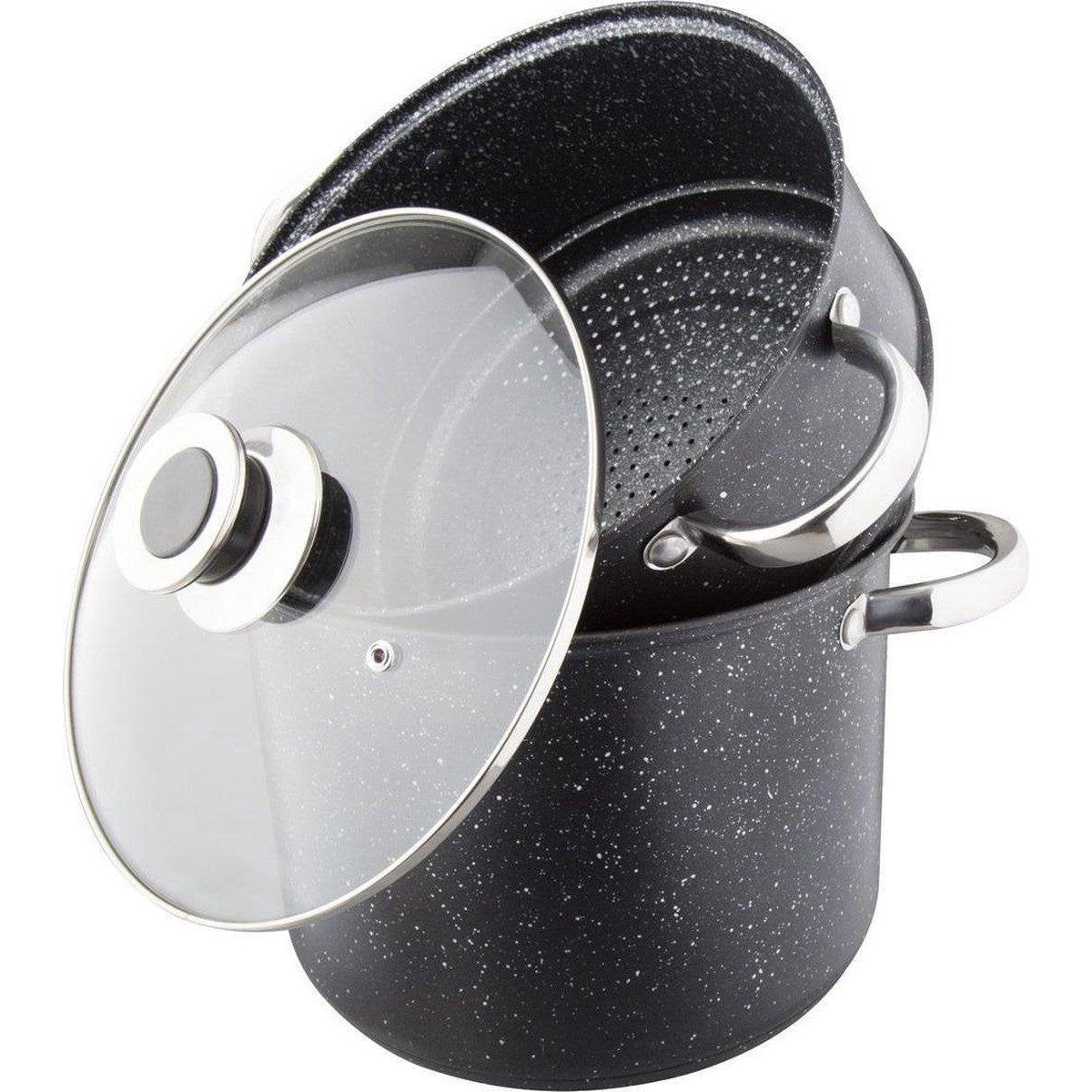 Couscoussier in hoogwaardig roestvrij staal met een inhoud van 8 liter. Deze stevige 3-delige couscouspan heeft een marmeren coating is zeer geschikt voor het bereiden van couscous, maar uiteraard ook voor het stomen van groente of het koken van rijst.