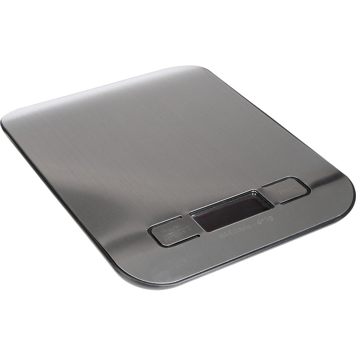 Digitale keukenweegschaal RVS zwart 17 x 13 cm. De digitale weegschaal heeft een LCD scherm waar het gewicht in grote cijfers wordt weergegeven. De weegschaal meet gewichten tussen de 1 en 5000 gram (5 kg) en schakelt zichzelf na gebruik uit, waardoor de batterijen langer meegaan. Voeding: 2x AAA batterijen (niet inbegrepen). Afmeting ca: L17 x B13 x H2 cm. Materiaal: RVS.
