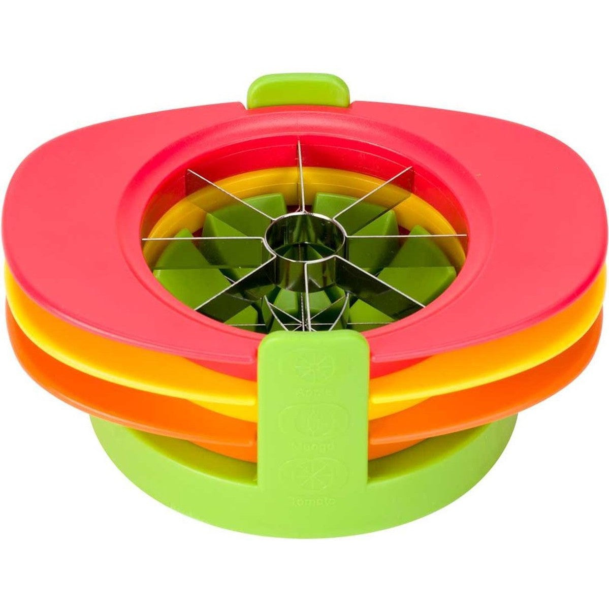 Met deze fruitsnijder verdeelt u snel en gemakkelijk fruit in partjes. De fruitsnijder heeft drie messen: een voor appels, een voor mango’s en een voor tomaten. Gebruiksaanwijzing: Plaats het stuk fruit rechtop in het midden van de basis en plaats het juiste mes op de vrucht. Zorg ervoor dat het klokhuis van appels en de pit van mango’s zich precies in het midden bevinden. Duw het mes naar beneden om te snijden.