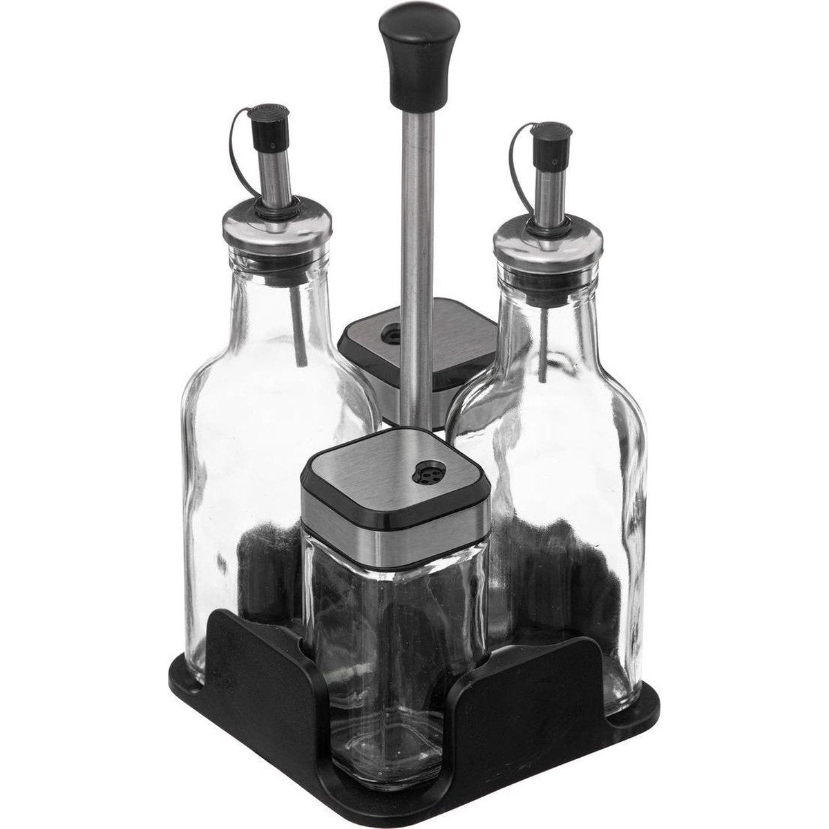 Verfraai je kruidenopslag met deze slanke set van zwart glas, perfect voor moderne keukeninterieurs. Deze 4-delige set bevat zowel hoge als lage potjes en een peper- en zoutstel, waardoor het een praktische en stijlvolle oplossing is om je kruiden georganiseerd en makkelijk toegankelijk te houden.- Gemaakt van hoogwaardig glas met een verfijnde zwarte afwerking.- Inclusief verschillende maten potjes voor verschillende opslagbehoeften.- Peper- en zoutstel voor een complete oplossing om kruiden op te bergen.Deze set geeft een moderne draai aan het traditionele opbergen van kruiden, met zijn doordachte ontwerp en multifunctionele onderdelen. De doorschijnende glazen potjes met een zwarte afwerking maken het gemakkelijk om de inhoud te identificeren en dragen bij aan een strakke en uniforme look in de keuken. Of je nu een gepassioneerde kok bent of gewoon een georganiseerde keukenomgeving wilt, deze set is een geweldige aanvulling voor je huis.Specificaties:Materiaal: glasAfmetingen product: Lengte 11,5 cm, Breedte 11,5 cm, Hoogte 23,5 cmWat zit er in de verpakking?1x Set kruidenpotjes en peper- en zoutstel