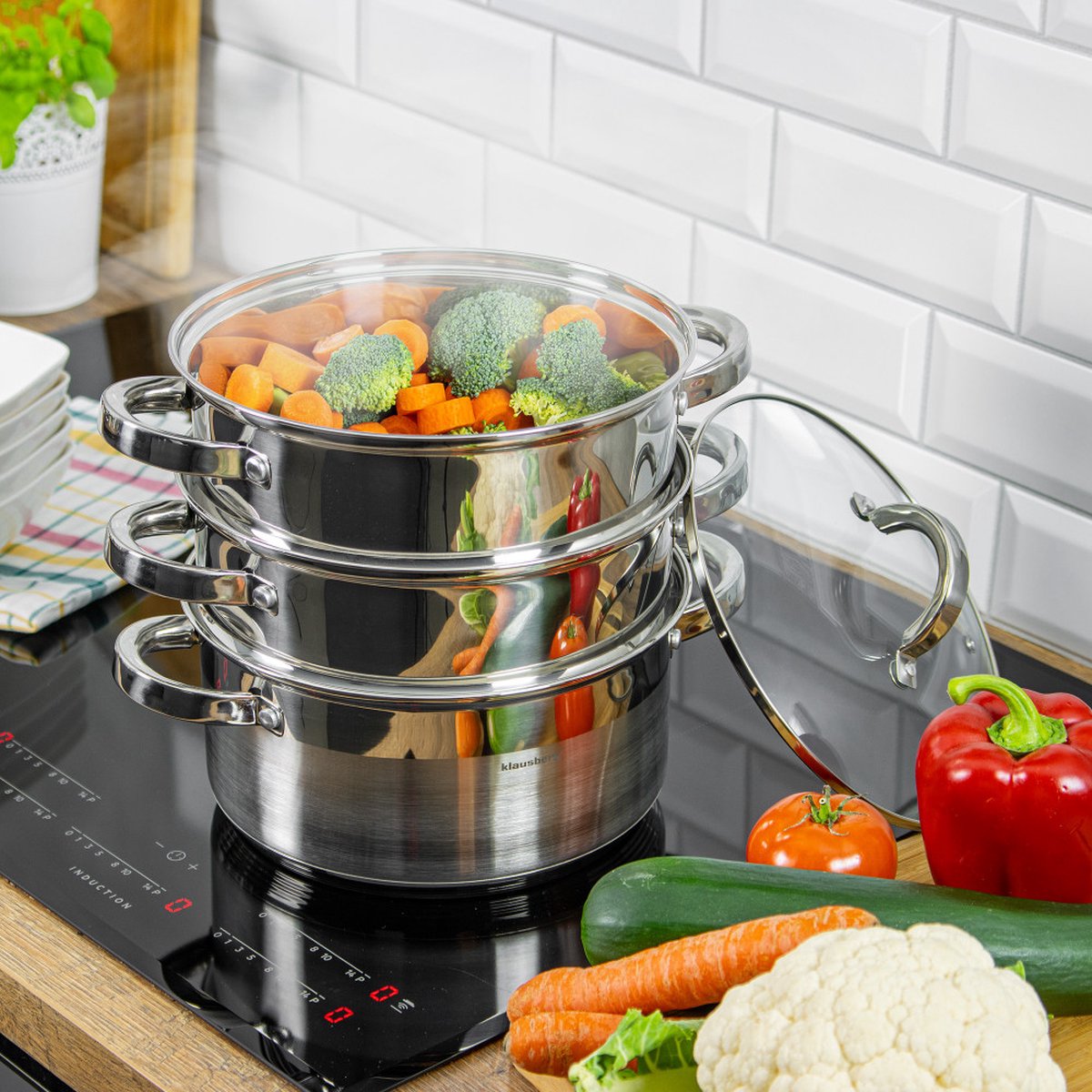 De Klausberg stoompan maakt koken tot een gemak. Door de meer-laagse rvs bodem van de pan zorgt dit voor een optimale warmte verspreiding. Door de afgeronde bodem is deze stoompan set gemakkelijk schoon te maken.