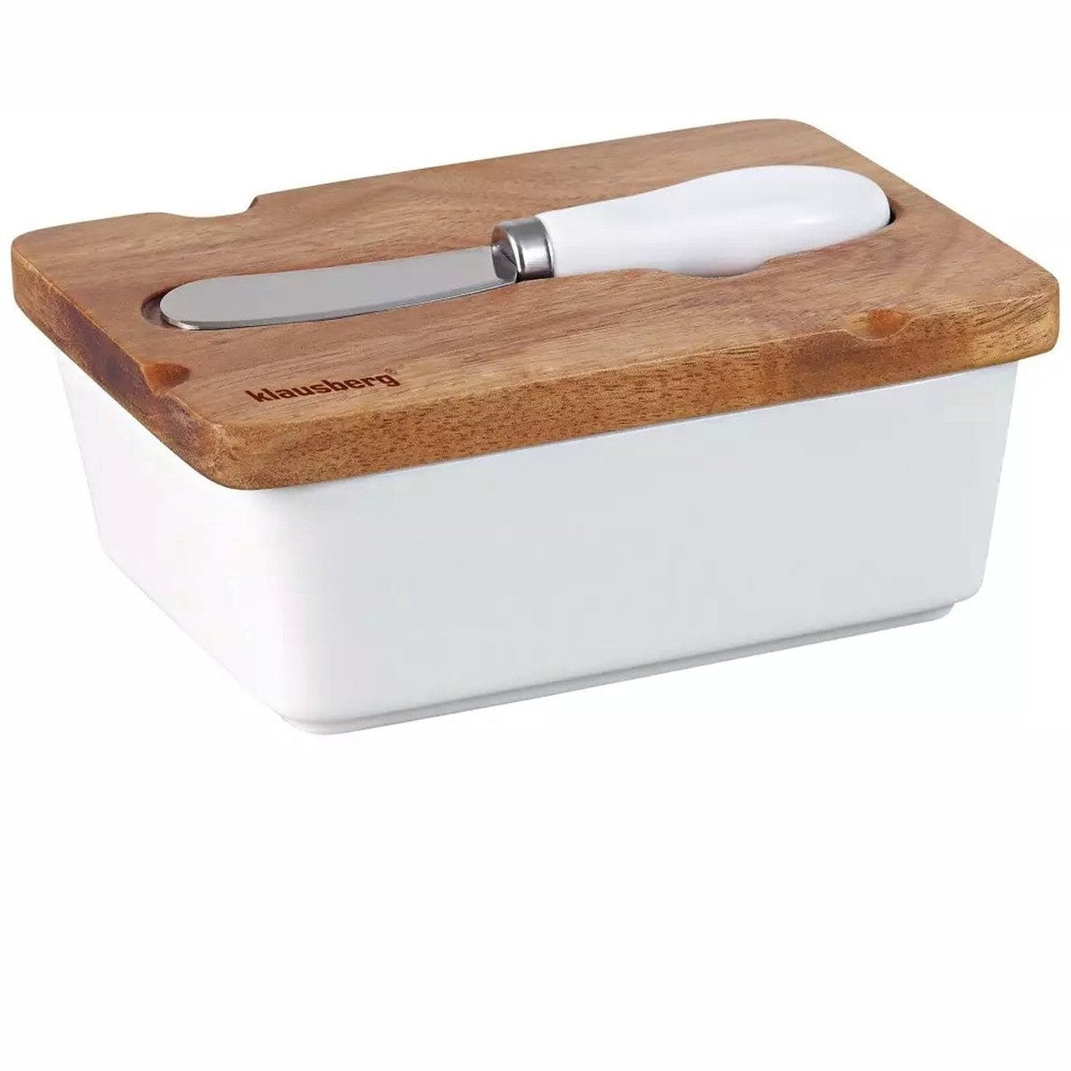 Klausberg Boterpot van Keramiek - Wit, Acaciahouten Deksel en Botermes - Stijlvol en Functioneel - Botervloot - Vershoudbakje Kaas