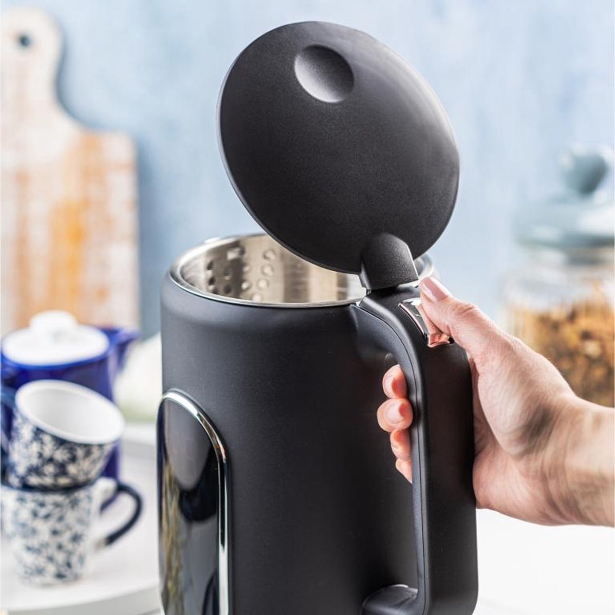 De matzwarte afwerking met verfijnde zilveren accenten past perfect in elke moderne keuken. Het strakke design combineert elegantie met functionaliteit.