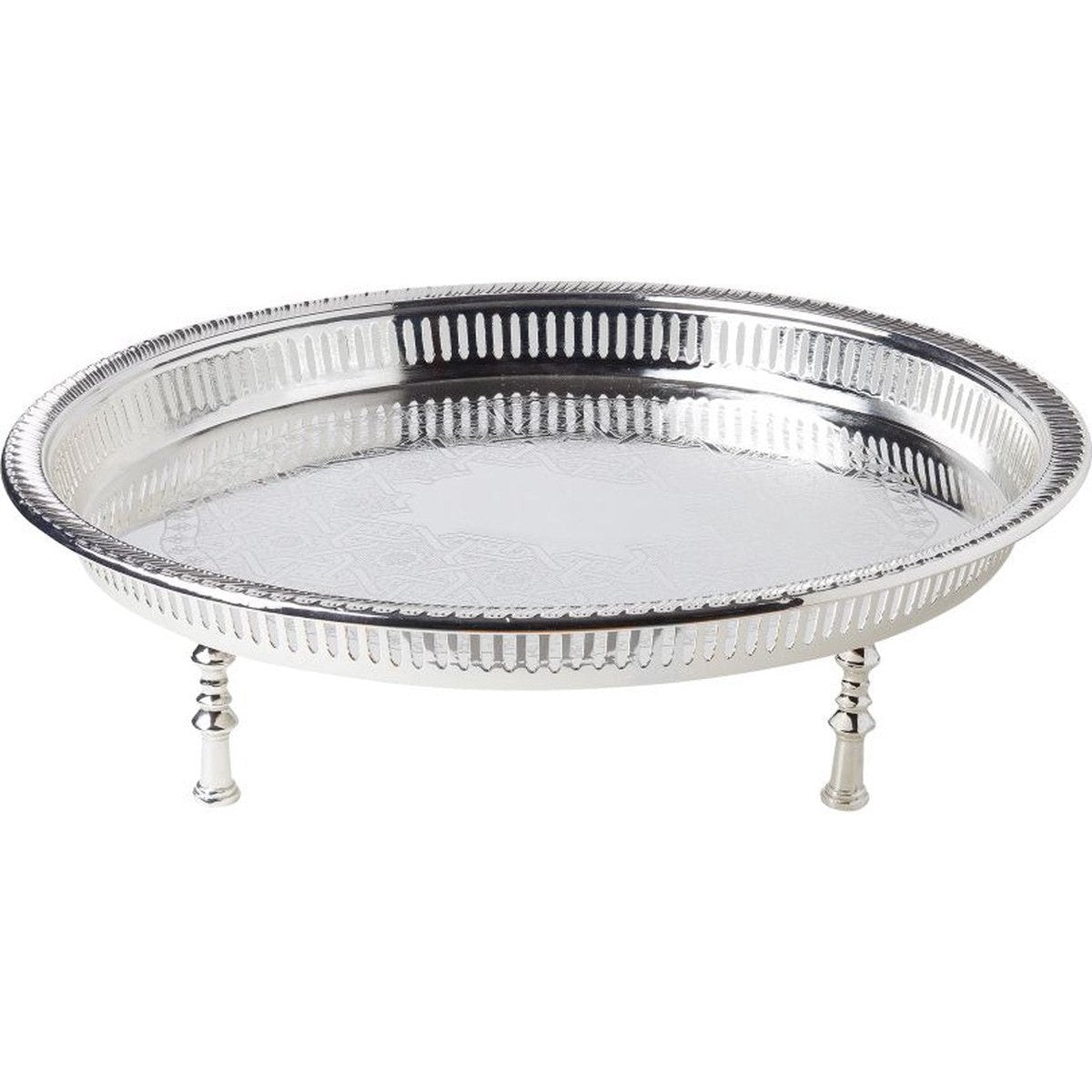 Rond hoge kwaliteit dienblad van verzilverd roestvrij staal. Sierlijk design en staat op drie pootjes van circa 10 cm hoog die zeer stevig zijn. Een extra verhoogd randje afgewerkt met een golvend randje. Doorsnee van Ø 45 cm