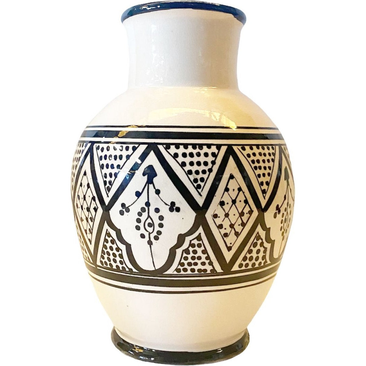 De Marokkaanse vaas heeft een prachtig patroon en heeft een fijn glansje door het glazuur.
