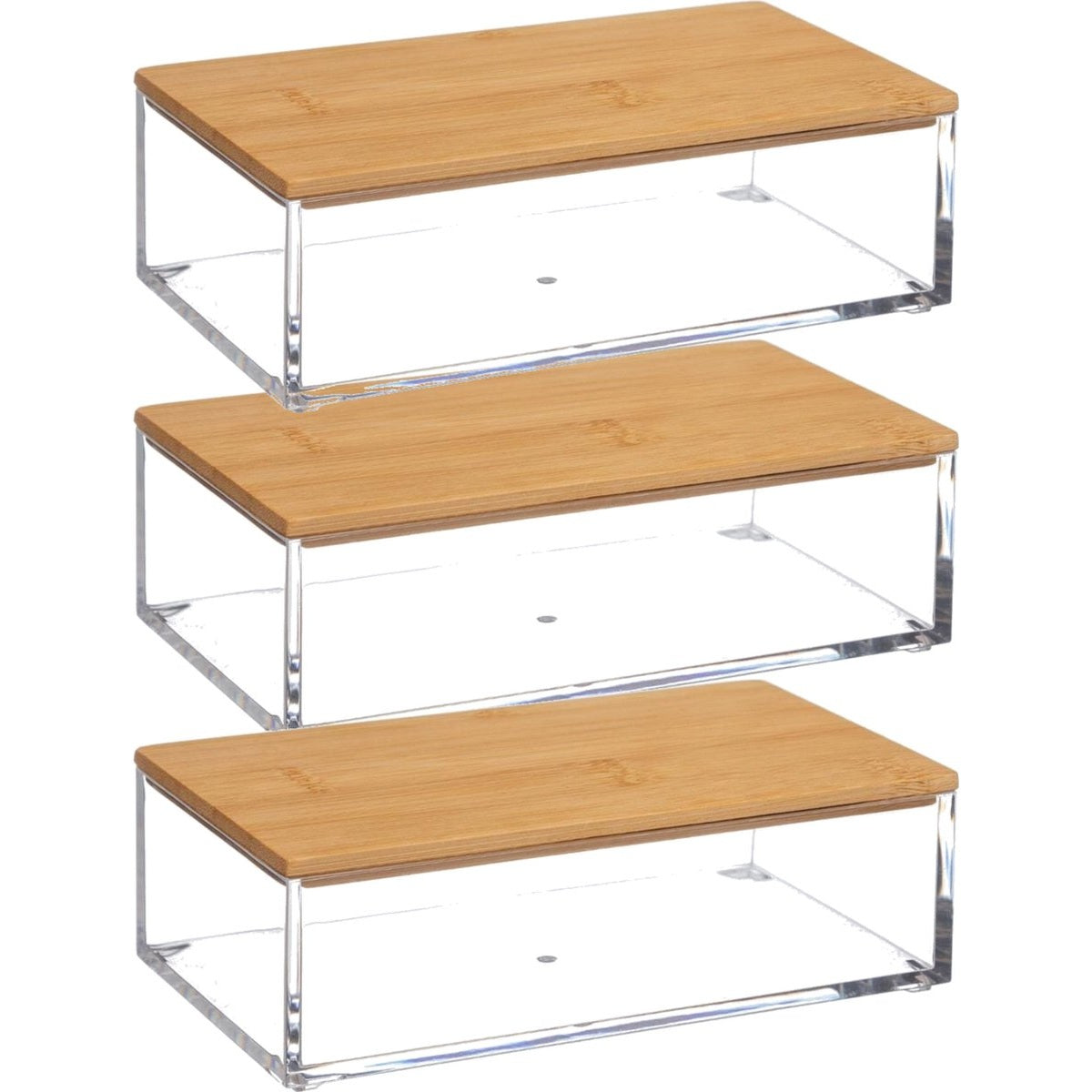 Set van 3x stuks sieraden/make-up houder/box 16 x 5 cm van kunststof. Een transparante rechthoekige organizer, met bamboe houten deksel, geschikt voor bijvoorbeeld uw sieraden, nagellak en/of make-up. Afmeting: ca. 16 x 9,5 x 5 cm. Inhoud: ca. 0,7 liter. Materiaal: kunststof/hout. Voor meer bijpassende producten uit deze serie zoekt u op de term: organizerselena.