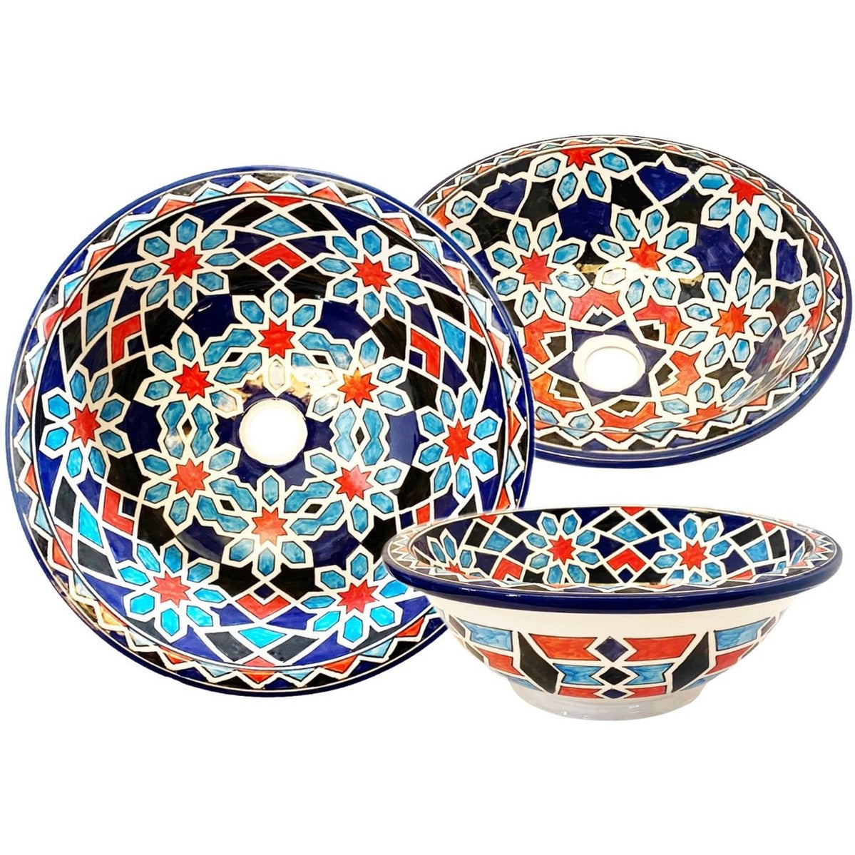 Handgemaakte Marokkaanse ronde wasbakken van keramiek , zijn met de hand gemaakt en beschilderd door handbeschilderd in Fes. De Marokkaanse waskom is leuk te combineren met spaanse, Andalusische of Marokkaanse tegels. Voeg wat kleur toe aan je badkamer met deze vrolijke waskom.